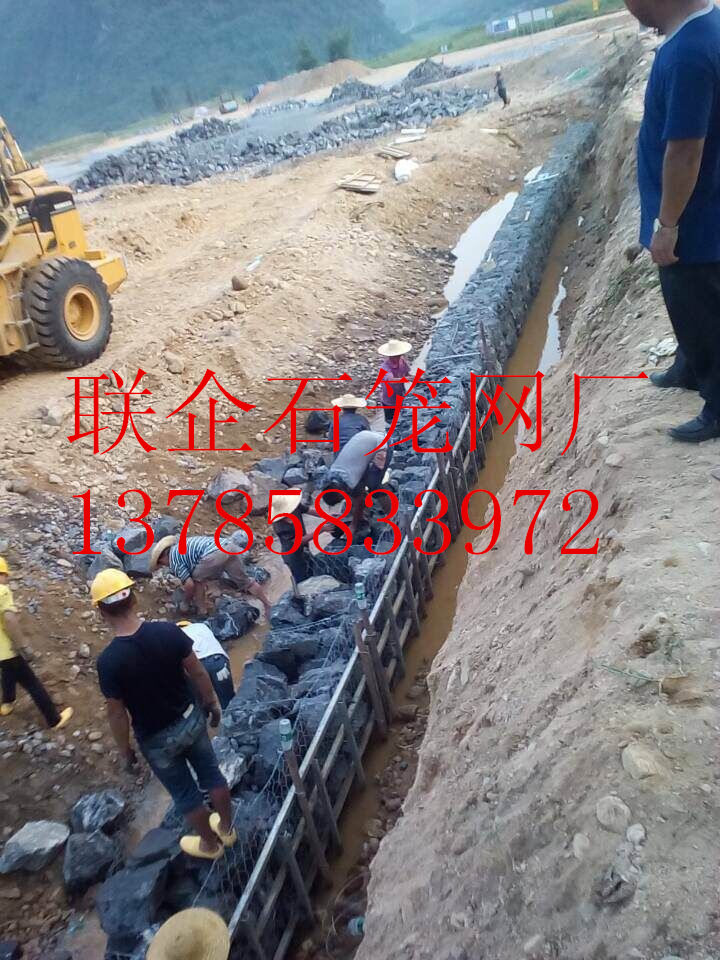 格賓籠在施工填充料前,應在格賓籠外露面綁扎竹竿,木棍,鋼管或面板等,待填充料施工結束后拆除。