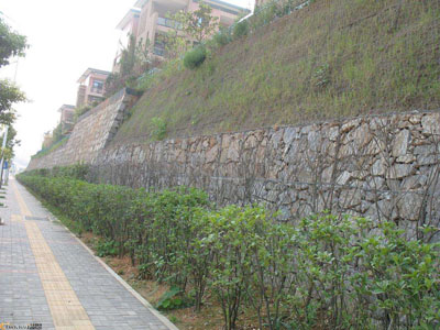 護坡石籠網中裝入塊石,塊石較大而平的一面擺在籠子周圍,使護坡石籠網四周平直,防止呈現凸凹現象,中心用顆料較小的石塊填塞嚴密,護坡石籠網四周石料不能小于網孔尺寸。護坡石籠網較上一層石塊擺放時,應大面朝上,確保護坡石籠網的平整,結尾關閉石籠網。